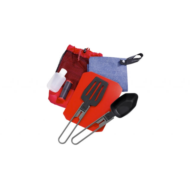 This lightweight, basic kitchen set includes all your favorite utensils and accessories wrapped in one convenient package.INCLUDES Folding Spoon, Spatula, Ultralight Cutting Board, Salt & Pepper Shaker, Squeeze Bottle and Dish Towel.