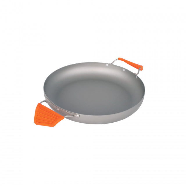 The X-Pan is an 8 inch fry pan that shares the same design philosophy as the X-Pots and fits neatly together with this nesting system. The a minimalist handle system uses two silicone wrapped grips that tuck securely underneath for transportation. Using a hard anodized aluminum, this compact pan allows the 2.8L X-Pot to friction fit neatly inside.