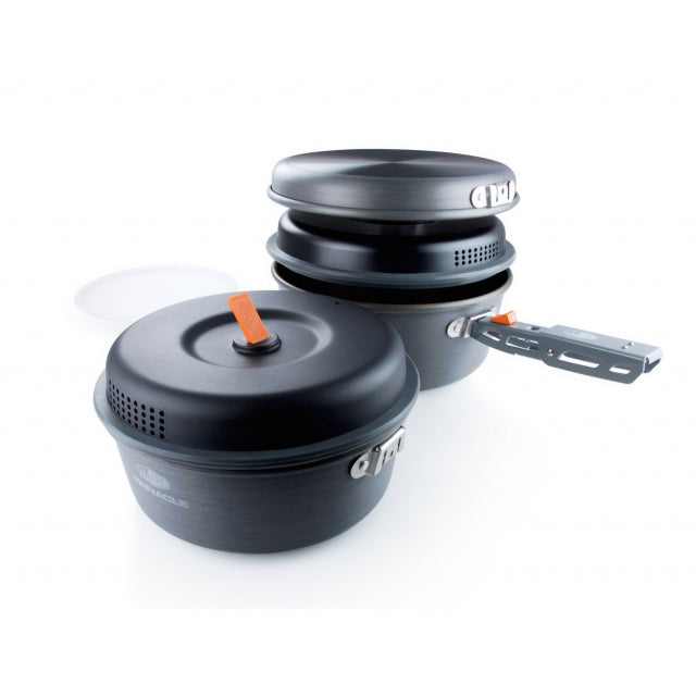 This is the Pinnacle our ultimate combo of cooking performance, durability, packability, and easy cleaning. Sized for trips with friends or family, it cooks for four or more and meets the demands of serious campsite gourmets. The 5L and 4L pots and 8" fry pan use Teflon with Radiance Technology for amazing non-stick performance, easy cleaning, and heat transfer that reaches temperature 25% faster than other coatings. And it's tough stuff go ahead and use that metal spatula. Strainer lids make straining easy, and there's a cutting board for prep work. All of it nests into a welded storage bag that doubles as a camp sink to make packing and storage easy.